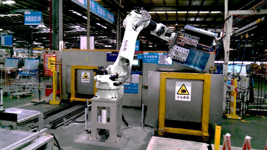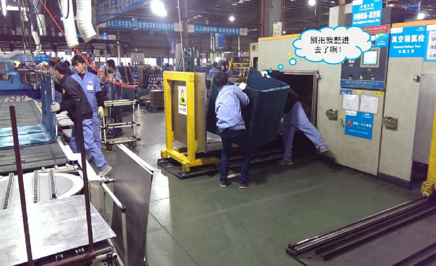 這臺機器人投入前,操作員的工作較為繁重。該生產(chǎn)線的大型換熱器最大重量將近70kg,需要2名員工以搬抬的方式進出真空箱,過程中還需多次翻轉,每天重復400余次,操作難度和勞動強度大。